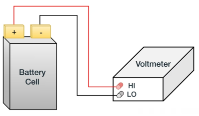 圖 1. 對電芯執行開路電壓測量需要將萬用表連接到電池的正負極端子。