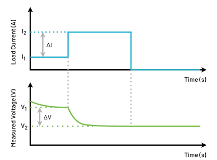 在一定的時間內對電池施加直流電流。測量電池電壓的變化以計算電阻。圖 3中的圖表對此進行了演示。