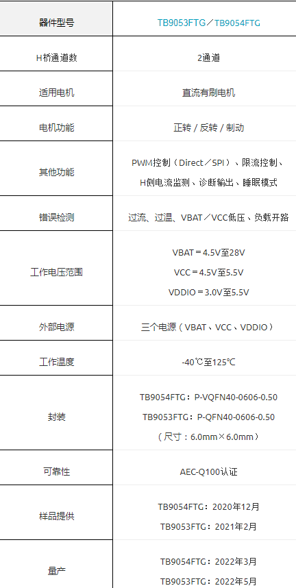 2020年12月10日——東芝電子元件及存儲裝置株式會社(“東芝”)今日宣布,推出兩種應用于電子節氣門等車載應用的直流有刷電機驅動IC——“TB9054FTG”和“TB9053FTG”。其中“TB9054FTG”采用可潤濕側翼VQFN封裝,“TB9053FTG”采用功率型QFN封裝。TB9054FTG現已提供樣品,預計在2022年3月開始量產;TB9053FTG將從2021年2月開始提供樣品,預計在2022年5月開始量產。