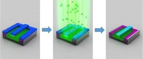 離子注入完成后,光刻膠也被清除,而注入區域(綠色部分)也已摻雜了不同的原子。到了這一步,晶體管已經基本完成。