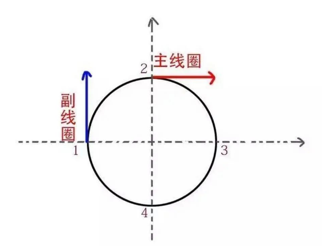如果沒有其他線圈提供的力,那么電機(jī)轉(zhuǎn)90度以后就不轉(zhuǎn)了。如果想要讓他旋轉(zhuǎn),還須給它加一個(gè)與主線圈方向垂直的力,由啟動(dòng)線圈提供,也就是副線圈。