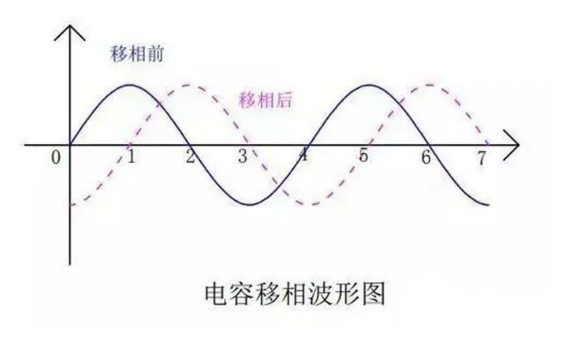 這時(shí)候就要采用電容移相了。簡(jiǎn)單的來說,就是把電容串聯(lián)在所需要移相的電路里,從而讓電流相位改變。單相交流電移相以后,那么它的波形圖就變成下圖這樣了。