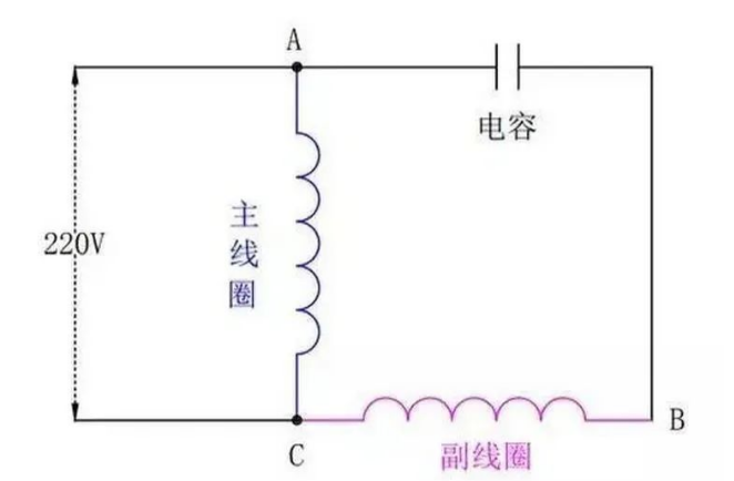 最后把它綜合起來,電機(jī)接線圖就成下圖這樣。首先正弦交流電從A點(diǎn)進(jìn)來,一部分給主線圈供電,另外一部分通過電容移相。由于兩相電他們的相位一前一后,那么線圈產(chǎn)生的磁場(chǎng)力也會(huì)一前一后。這樣,就可以達(dá)到主線圈推一下,然后副線圈推一下,最后旋轉(zhuǎn)起來。