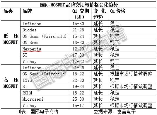 目前,高端MOSFET交期仍高達15-30周,而中低端MOSFET交期相對穩定,在4-8周左右。根據富昌電子(Future Electronics)2020年Q1市場行情報告顯示,不考慮任何運輸延誤的前提下,分立器件Q1交期普遍受到影響,平均交期與上季度相比拉長4周左右,價格也將隨市場狀況做出調整。