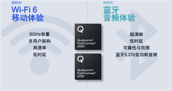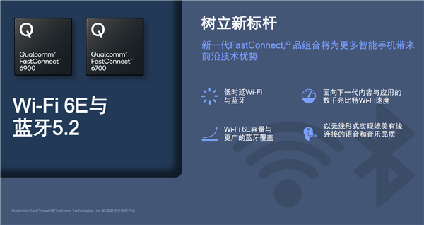 除了全線支持Wi-Fi 6E、三頻段的第二代Networking Pro系列無線平臺,高通今天還發布了全球領先的移動無線連接產品組合,Wi-Fi 6E 6GHz頻段、藍牙5.2緊密地結合在一起,速度也是全球第一。