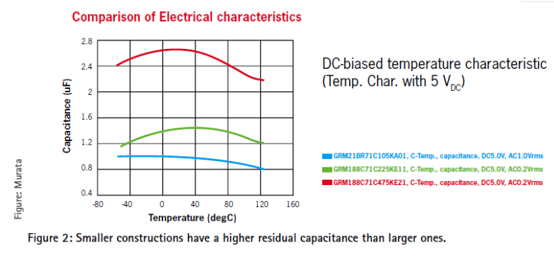 影響直流偏置性能的另一個因素是工作溫度,如圖2的圖表所示,對于標稱值較高的較小結構MLCC電容,直流偏置的剩余電容和溫度遠遠高于標稱值較低的較大結構MLCC電容。