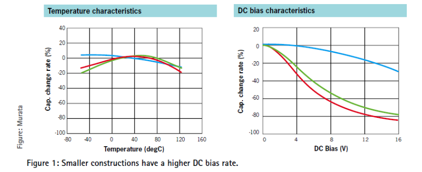 特別是對于高電容(hi-cap)器件,即C值以μF為單位的MLCC產品,其直流偏置效應也是需要考慮的重要因素。直流偏置是基于施加的直流電壓而導致電容降低的效應。在額定電壓下,電容有可能下降到標稱值的20%左右,具體數值取決于元器件,因此在操作期間必須注意絕對最小C值。