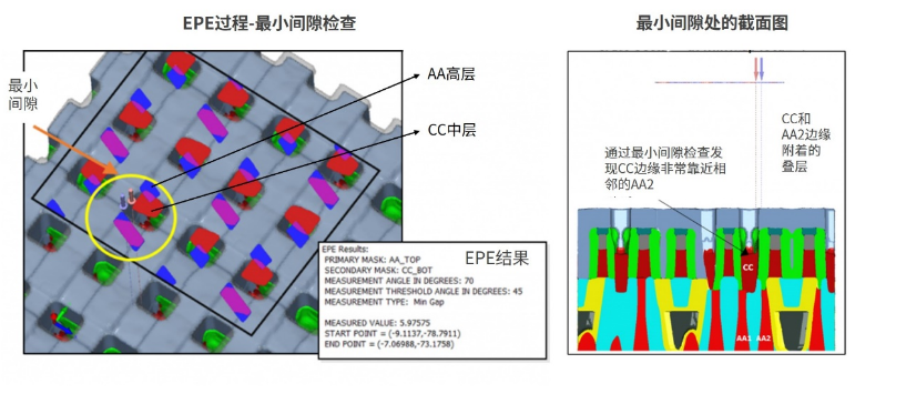 僅依靠基于晶圓的實驗很難找出晶圓級失效的原因并確定與之相關的工藝參數。在工藝變化研究中制造測試晶圓并測量晶圓上的最終接觸面積,費時且成本較高。先進的工藝建模技術能幫我們解決前述問題。通過對BL間隔層厚度變化和BL掩膜位移同時建模,基于DoE(實驗設計)統計變化研究,可以確定最小接觸區域。基于前述研究的結果,結合自帶的結構搜索/DRC功能就可以確定具體芯片上的最小接觸位置和區域。SEMulator3D?就是一個能完成上述研究的工藝建模平臺。基于該平臺的工藝變化研究能夠幫助我們發現與BL芯軸間隔厚度和掩膜轉換相關的潛在問題。圖1 (a) 展示的就是用SEMulator3D檢查BL間隔厚度和掩膜轉換對BL/AA接觸面積的影響,而圖1 (b) 則顯示了最小接觸區域在芯片上的位置。