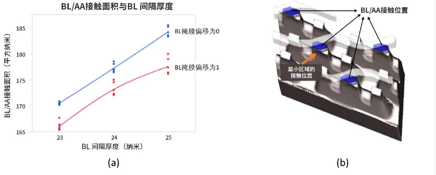 圖1. (a) BL/AA接觸面積與BL間隔厚度和掩膜偏移的關系;(b) 最小接觸區域及其位置。