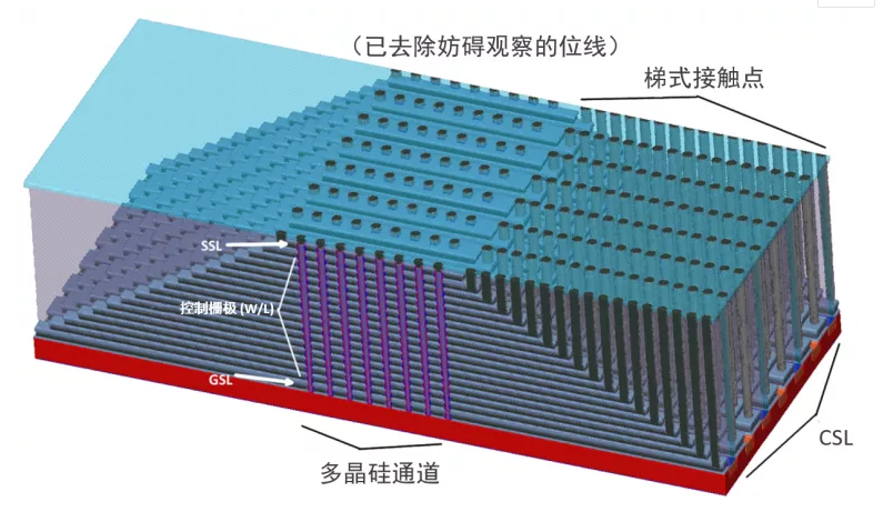 單層3D NAND結構的刻蝕非常復雜,因為高深寬比必須在一組交替的材料中刻蝕,同時還要避免刻蝕孔發生彎曲和傾斜,并且需要專門刻蝕出用來分離相鄰存儲單元的“狹縫”。完整3D NAND結構的刻蝕甚至要更復雜一些,因為其中還包含了形成字線 (WL) 觸點所必需的“梯式”刻蝕。圖3展示的是用SEMulator3D建模的完整3D NAND陣列,可以看出最先進的3D NAND存儲器結構相當復雜,而且這還只是單層結構。