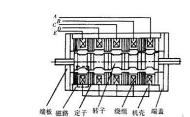 步進電機的定子可以做成三、四、五、六相甚至于做成八相,各相繞組可在定子上徑向排列,也可在定子的軸向上分段排列。
