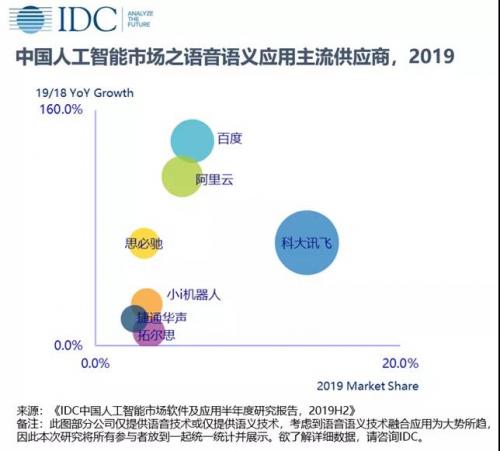 除了智能家居等消費級產品普及帶來的機會之外,智能客服、法庭庭審語音轉文字,貢獻了較大的市場規模。2019 年全年中國語音語義應用市場達 1224.9 百萬美元。科大訊飛依然占據領先地位但市場份額有所下滑,思必馳等創企憑借差異化優勢依然占據一定的市場份額,而百度、阿里、華為、騰訊等廠商也開始在這一市場占有一席之地。