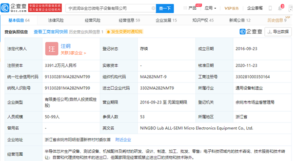 寧波潤華全芯微電子設備有限公司成立于2016年,法定代表人為汪鋼,注冊資本3391.2萬元人民幣,經營范圍包含:半導體芯片生產設備、測試設備、機械配件及耗材的研發、設計、制造、加工、批發、零售等。 根據官網資料,該公司主要從事化合物半導體、LED、SAW、 OLED、光通訊、MEMS、先進封裝等新型電子器件制造領域,配備了快速響應的銷售和技術服務團隊,目標是成為一家具有國際影響力的半導體裝備及工藝解決方案提供商。