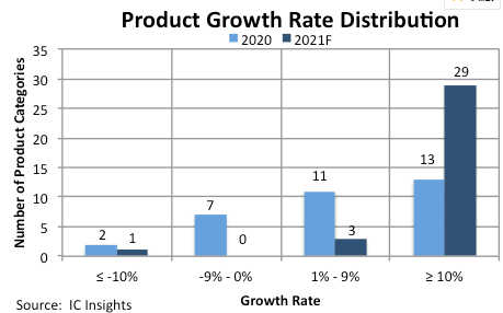 另外,針對2021年預測營收成長率排名的33個主要半導體IC產品中,預計許多特殊用途的邏輯半導體IC類別將在營收成長榜上名列前茅。另外,還有DRAM、手機MPU和顯示驅動IC等品項,這些產品的銷量都有望增長30%以上,目前IC市場的總銷量預計將增長24%。