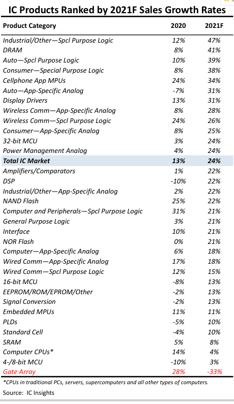 報告強調,查看以往顯示半導體產業強勁成長的年份的報告數據中,帶動半導體市場的成長的貢獻主要來自較少數IC產品品項。2021年情況則完全相反:強勁的營收成漲趨勢似乎已經滲透到整個半導體產業當中的幾乎所有IC產品品項,只有銷量較小的市場 ( 2021年預測銷售額約5,800萬美元)的閘陣列式芯片(Gate array chip, 如FPGA)沒有跟上團隊的腳步。