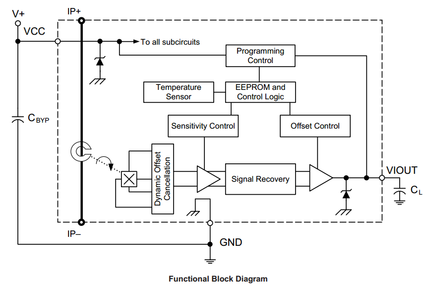 當增加的電流流過主銅導電路徑(從端子4到端子5)時,器件的輸出具有正斜率(對于雙向器件> V CC / 2),這是用于電流采樣的路徑。該導電路徑的內阻典型值為100μΩ,功耗低。