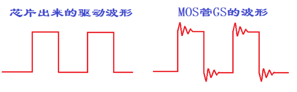 我們測死MOS管GS波形時,有時會看到下圖中的這種波形,在芯片輸出端是非常好的方波輸出,但一旦到了MOS管的G極就出問題了,有振蕩,這個振蕩小的時候還能勉強過關,但是有時候振蕩特別大,看著都教人擔心會不會重啟。