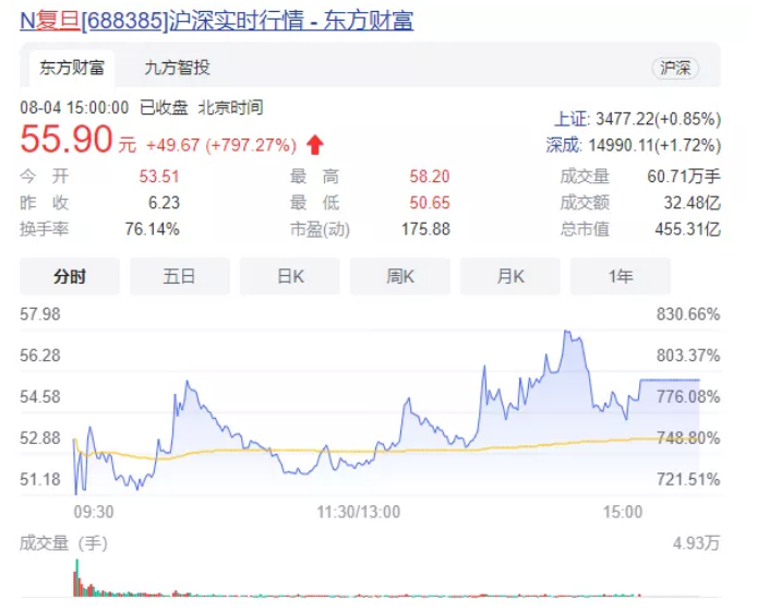8月4日消息,上海復(fù)旦微電子集團(tuán)股份有限公司(證券簡(jiǎn)稱“復(fù)旦微電”,證券代碼“688385”)在科創(chuàng)板上市,發(fā)行價(jià)格6.23元/股。4日開盤,公司股價(jià)報(bào)53.51元/股。截至今日收盤,復(fù)旦微電總市值已達(dá)到455.31億元。
