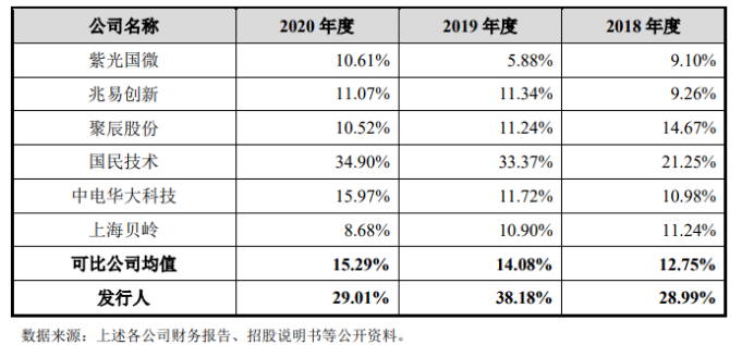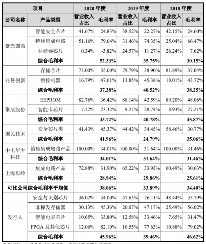 復(fù)旦微電近年來(lái)的盈利能力客觀,綜合毛利率高于可比公司綜合毛利率平均值。招股書顯示,2018年、2019年及2020年公司營(yíng)業(yè)收入分別為14.24億元、14.73億元和16.91億元,營(yíng)收保持穩(wěn)健增長(zhǎng),盈利能力可觀。綜合毛利率分別為46.62%、39.46%和45.96%,整體上高于同行業(yè)平均水平。
