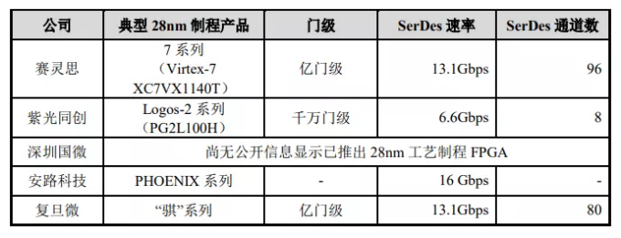 國(guó)內(nèi)紫光同創(chuàng)于2020年初發(fā)布了28nm工藝制程的千萬(wàn)門級(jí)FPGA產(chǎn)品,SerDes傳輸速率6.6Gbps;安路科技于2020年推出了PHOENIX系列產(chǎn)品,SerDes傳輸速率 16Gbps。目前賽靈思及國(guó)內(nèi)同行業(yè)FPGA廠商典型28nm制程產(chǎn)品情況如下: