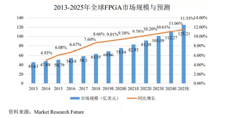 隨著目前 5G 時(shí)代的進(jìn)展以及 AI 的推進(jìn)速度,F(xiàn)PGA全球市場(chǎng)規(guī)模近年來(lái)穩(wěn)步增長(zhǎng),從2013年的45.63億美元,增至2018年的63.35億美元。根據(jù)Market Research Future的預(yù)測(cè),F(xiàn)PGA全球市場(chǎng)規(guī)模在2025年有望達(dá)到約125.21億美元。