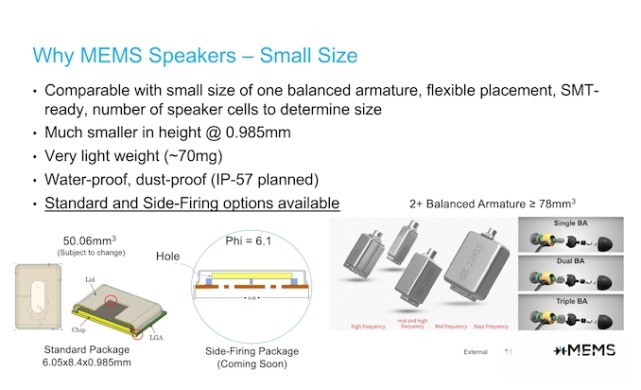 尺寸也是這項(xiàng)新技術(shù)的主要優(yōu)勢(shì)。目前,xMEMS正在生產(chǎn)一種能讓聲音從封裝里呈垂直角度向外發(fā)出的標(biāo)準(zhǔn)封裝解決方案,該封裝尺寸為8.4×6.05×0.985 mm,但我們也將看到一個(gè)具有相同尺寸的邊側(cè)發(fā)聲解決方案,不論如何,這一切能讓制造商可以更好地管理內(nèi)部耳機(jī)設(shè)計(jì)和零部件定位作業(yè)。