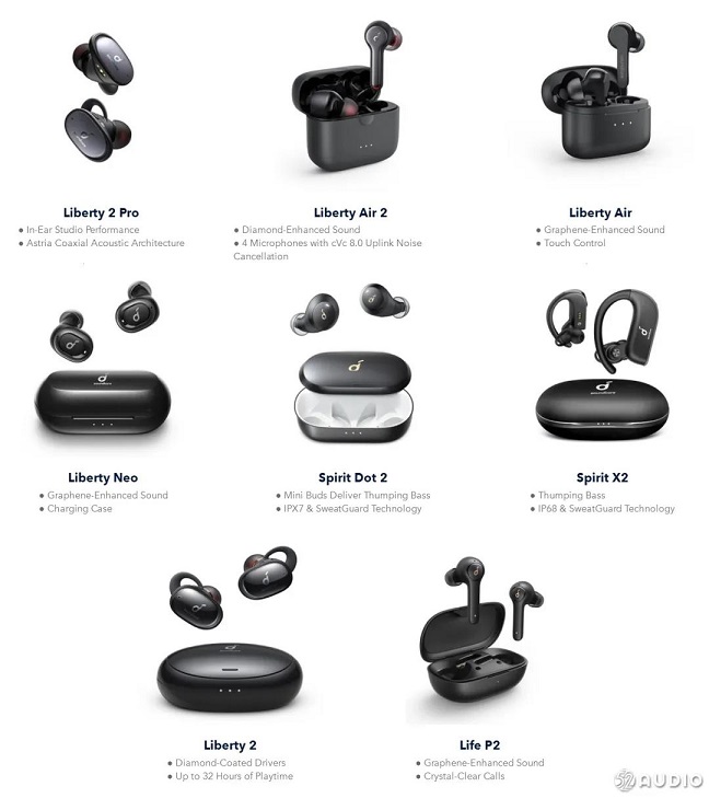 雖然公司頭部產(chǎn)品一直是手機(jī)相關(guān)配件,但Anker在真無(wú)線耳機(jī)市場(chǎng)爆發(fā)前夕就做了大量的準(zhǔn)備, 先后推出過(guò)頸掛式藍(lán)牙耳機(jī)、藍(lán)牙運(yùn)動(dòng)耳機(jī)、藍(lán)牙音箱和便攜音箱等;2020年在國(guó)內(nèi)正式注冊(cè)了Soundcore聲闊這一音頻品牌,全力投入到TWS真無(wú)線耳機(jī)市場(chǎng)中。