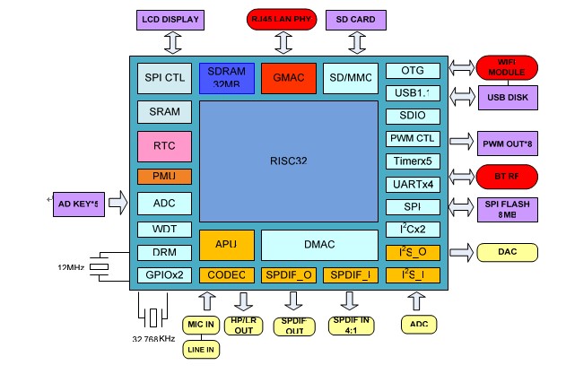 SC6138A 是一顆高集成度,專注于無線音樂、音頻編解碼、音效處理的 SoC 芯片。它集成了 APU 單元,專門來 處理音頻相關的算法,同時還將音頻 DAC/ADC、音頻接口、USB/SD/以太網控制器等集成在單芯片中,從而實現音樂 播放,無線推送和音效處理等多方面的應用。
