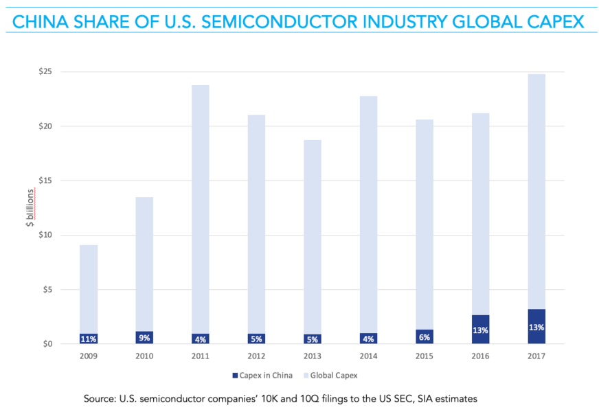 一些報告和政策制定者最近宣稱,美國半導體公司正在將芯片生產大量外包給中國。雖然目前美國半導體制造業的份額僅占全球產能的12%,而且美國公司設計的芯片在海外生產的數量比美國本土的還要多,但事實上,大多數美國芯片并非在中國生產。例如,美中經濟與安全審查委員會(USCC)最近的一份報告指出,美國跨國企業(MNE)在華半導體制造資產的資本支出從2010年的12億美元躍升至2017年的32億美元,提高了166.7%。然而,該報告并沒有從歷史上的全球資本支出支出的角度來看待這些投資。雖然從表面上看,這聽起來像是一大筆錢,而且增長率非常高,但與美國行業歷史上的年度資本支出相比,這個數字相對還很小。