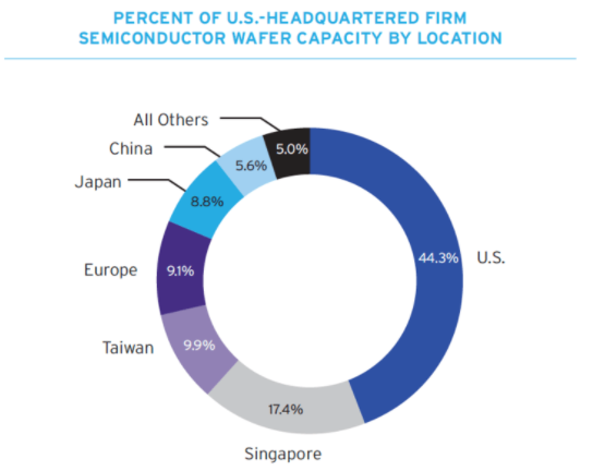 仔細研究,現實情況是,美國公司在中國建立的半導體前端產能僅占美國公司全部產能的5.6%,美國半導體制造商44%的生產能力仍在美國,遍布18個州70家工廠。但正如圖表所示,許多美國公司選擇了將業務擴展到海外,因為那里有更具吸引力的政策。
