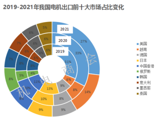 2021年,美國、越南、德國、日本、中國香港、俄羅斯、韓國、意大利、墨西哥、泰國是我國電機出口的前十大目的地,占我國電機產品出口總額50.6%。其中,我對美出口電機類產品29.2億美元,同比增長19.4%,居第一位;對越南出口15.6億美元,同比大幅增長161.5%,居第二位。風力發電機組是我對越出口第一大電機類產品,出口額7.1億美元,同比大幅增長821.5%,占對越出口同類產品總額的45.6%。近年來,中越經貿關系發展迅速,越南基礎設施建設需求增大,新能源發電需求增長,進一步加大對電機類產品的需求,我電機對越出口呈逐年大幅上升態勢。