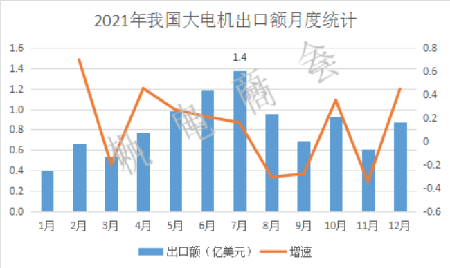 據我國海關統計,2021年我國大電機出口10億美元,同比增長67.9%,創歷年新高。從單月來看,7月出口1.4億美元,達本年度單月出口峰值。進口1.3億美元,同比增長13%。