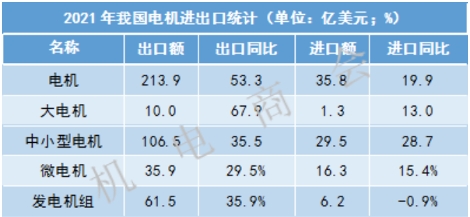 2021年,我國電機產品出口最主要的依然為中小型電機,同時大電機、微電機、發電機組等出口額同比均實現兩位數增長。