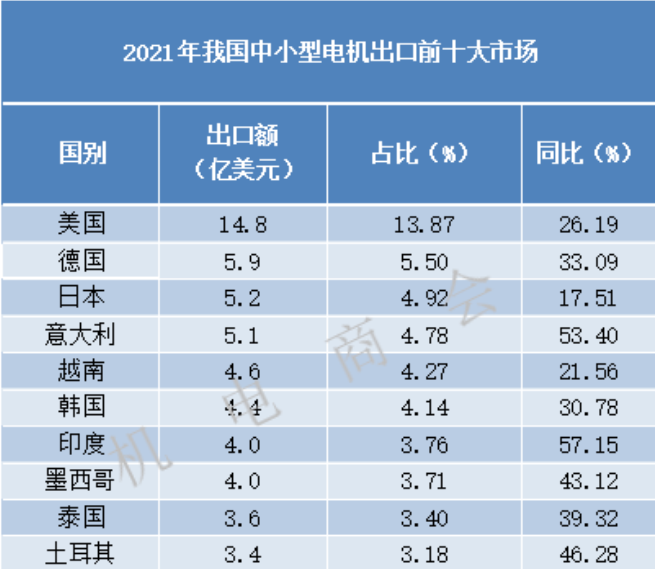 美國、德國、日本、意大利、越南、韓國、印度、墨西哥、泰國、土耳其是我國中小型電機出口前十大市場,占我中小型電機出口額的51.5%。前十位市場出口額及占比情況如下表: