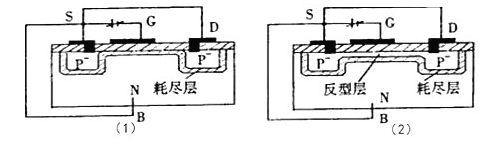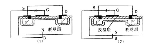 隨著G、S間負電壓的增加,耗盡層加寬,當VDS增大到一定值時,襯底中的空穴(少子)被柵極中的負電荷吸引到表面,在耗盡層和絕緣層之間形成一個P型薄層,稱反型層,如圖表6(2)所示。