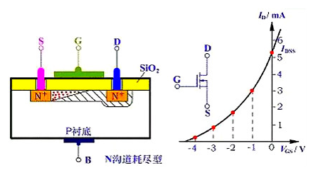 圖表9 N溝道耗盡型MOS管結構(左)及轉移特性(右)示意圖