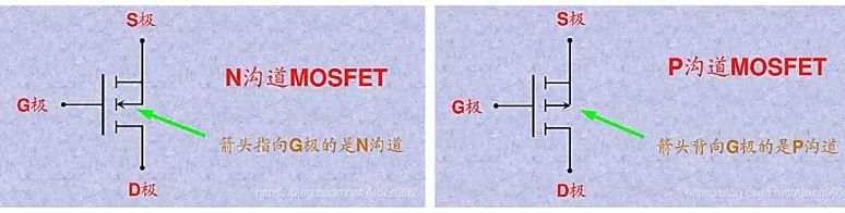 箭頭指向 G 極的為 NMOS;箭頭背向 G 極的為 PMOS;