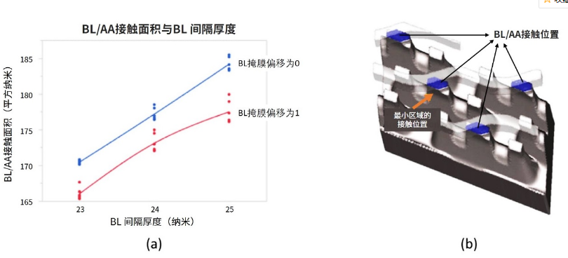 圖1. (a) BL/AA接觸面積與BL間隔厚度和掩膜偏移的關(guān)系;(b) 最小接觸區(qū)域及其位置。