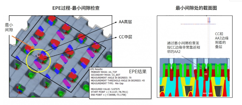 僅依靠基于晶圓的實(shí)驗(yàn)很難找出晶圓級(jí)失效的原因并確定與之相關(guān)的工藝參數(shù)。在工藝變化研究中制造測(cè)試晶圓并測(cè)量晶圓上的最終接觸面積,費(fèi)時(shí)且成本較高。先進(jìn)的工藝建模技術(shù)能幫我們解決前述問題。通過對(duì)BL間隔層厚度變化和BL掩膜位移同時(shí)建模,基于DoE(實(shí)驗(yàn)設(shè)計(jì))統(tǒng)計(jì)變化研究,可以確定最小接觸區(qū)域。基于前述研究的結(jié)果,結(jié)合自帶的結(jié)構(gòu)搜索/DRC功能就可以確定具體芯片上的最小接觸位置和區(qū)域。SEMulator3D?就是一個(gè)能完成上述研究的工藝建模平臺(tái)。基于該平臺(tái)的工藝變化研究能夠幫助我們發(fā)現(xiàn)與BL芯軸間隔厚度和掩膜轉(zhuǎn)換相關(guān)的潛在問題。圖1 (a) 展示的就是用SEMulator3D檢查BL間隔厚度和掩膜轉(zhuǎn)換對(duì)BL/AA接觸面積的影響,而圖1 (b) 則顯示了最小接觸區(qū)域在芯片上的位置。