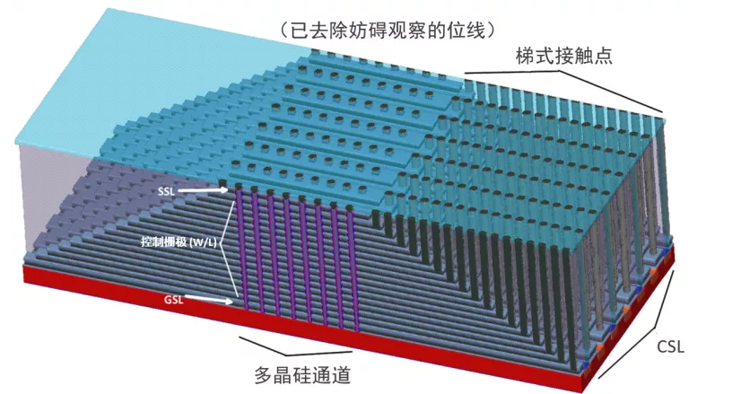 單層3D NAND結(jié)構(gòu)的刻蝕非常復(fù)雜,因?yàn)楦呱顚挶缺仨氃谝唤M交替的材料中刻蝕,同時(shí)還要避免刻蝕孔發(fā)生彎曲和傾斜,并且需要專門刻蝕出用來分離相鄰存儲(chǔ)單元的“狹縫”。完整3D NAND結(jié)構(gòu)的刻蝕甚至要更復(fù)雜一些,因?yàn)槠渲羞€包含了形成字線 (WL) 觸點(diǎn)所必需的“梯式”刻蝕。圖3展示的是用SEMulator3D建模的完整3D NAND陣列,可以看出最先進(jìn)的3D NAND存儲(chǔ)器結(jié)構(gòu)相當(dāng)復(fù)雜,而且這還只是單層結(jié)構(gòu)。