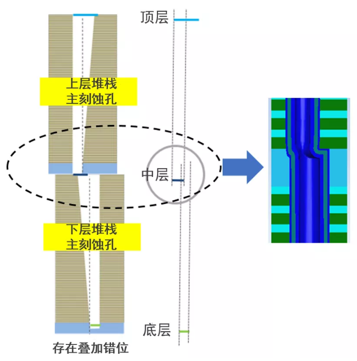 工藝的復(fù)雜性在2D向3D閃存結(jié)構(gòu)的過渡中急劇提升,原因在于3D結(jié)構(gòu)需要多層溝道的刻蝕。當(dāng)今的大多數(shù)3D NAND存儲(chǔ)器都有兩層,這就意味著可能出現(xiàn)頂層與底層錯(cuò)位問題。圖4展示的就是多層3D NAND溝道刻蝕面臨的問題和挑戰(zhàn)。