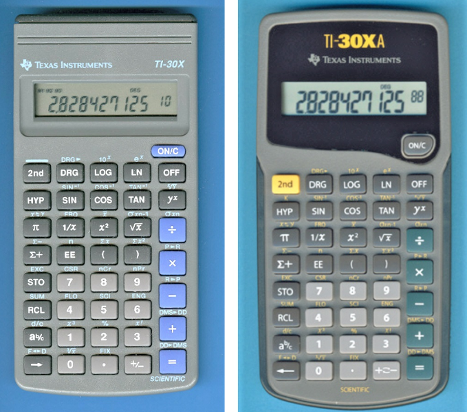 圖1:較舊款的TI-30X和較新一代的TI-30XA盡管其出廠年份不同,但外觀非常相似。不過,新款計(jì)算器有著較大的數(shù)字也更清楚易讀,但幾乎看不到小數(shù)點(diǎn)——再仔細(xì)看看兩張圖片上的顯示屏幕,小數(shù)點(diǎn)同樣都位于最左側(cè)的“2”和“8”之間.