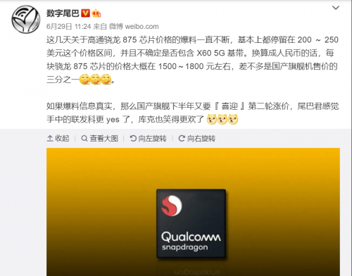 不過,這個售價信息很快得到了業內人士的否認,并實錘了驍龍 865 降價的情況,還有數碼博主曝光了驍龍 865 的降價幅度。這也印證了高通 5G 目前“有價無市“的困境。