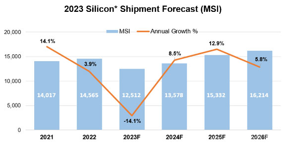 美國加州時間2023年10月26日,SEMI在其年度硅出貨量預測報告中指出,受半導體需求的持續疲軟和宏觀經濟狀況影響,2023年全球硅晶圓出貨量預計將下降14%,從2022年創紀錄的14565百萬平方英寸(million square inches, MSI)降至12512百萬平方英寸,隨著晶圓和半導體需求的恢復和庫存水平的正常化,全球硅晶圓出貨量將在2024年反彈。