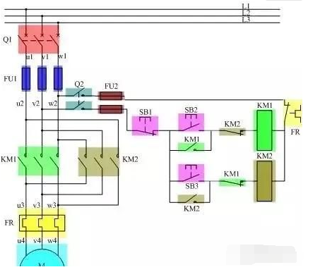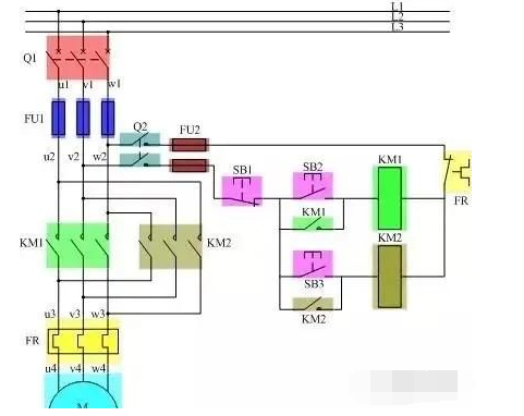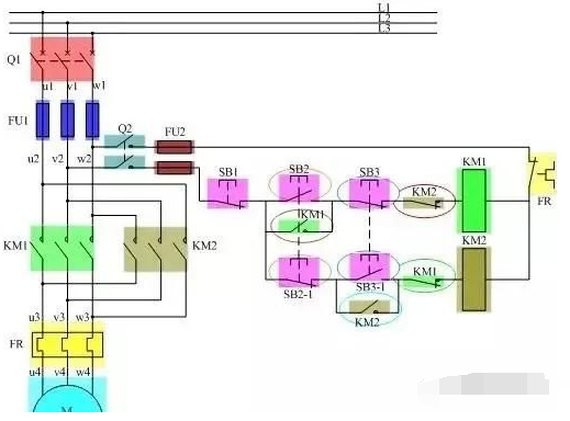 圖3中所示的控制線路改進(jìn)了不能一鍵反轉(zhuǎn)的缺陷,它采用了復(fù)合按鈕SB2與SB2-1(圖3中的金色圈顯現(xiàn))、SB3與SB3-1(圖3中的深藍(lán)色圈顯現(xiàn))。