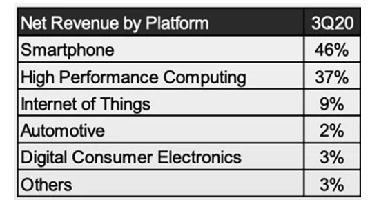 從各個細分市場的貢獻占比來看,智能手機市場貢獻的營收占比最高達46%,環比增長12%;高性能計算(HPC)占比37%,環比增長25%;IoT占比9%,環比增長24%;汽車及DCE市場貢獻的營收環比均出現了20%以上的下滑。