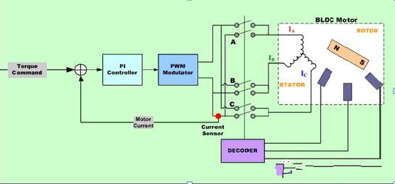 正弦電流命令信號輸出一對在兩個適當的電機繞組中調制電流的P-I控制器。第三個轉子繞組中的電流是受控繞組電流的負和,因此不能被分別控制。每個P-I控制器的輸出被送到一個PWM調制器,然后送到輸出橋和兩個電機終端。應用到第三個電機終端的電壓源于應用到前兩個線組的信號的負數和,適當用于分別間隔120度的三個正弦電壓。
