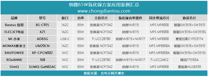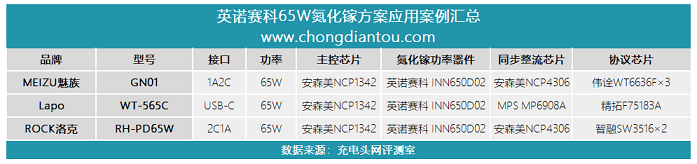 充電頭網通過對比以往拆解的16款市售熱門65W氮化鎵快充充電器案例(安克、倍思、小米、魅族、努比亞、京造、OPPO、RAVPOWER等品牌都在其中),發現以上產品的氮化鎵功率芯片供應商主要有PI、納微、英諾賽科三家。