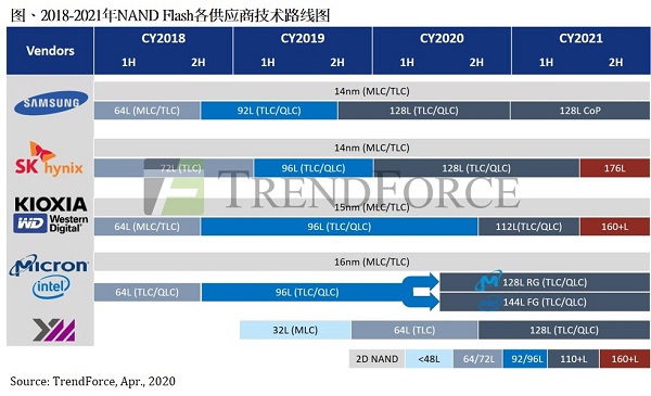 隨著3D NAND Flash堆棧達到90層以上,主要供應(yīng)商在更高層數(shù)蝕刻及堆棧技術(shù)的發(fā)展難度逐漸增加。觀察各供應(yīng)商的技術(shù)路線圖,在1XX層的產(chǎn)品世代已有分歧:盡管三星(Samsung)、SK海力士(SK Hynix)已推出128層產(chǎn)品,但鎧俠/西數(shù)(Kioxia/WD)、美光(Micron)、英特爾(Intel)的112/128/144層產(chǎn)品要到下半年才會放量,相比前幾代3D NAND產(chǎn)品的發(fā)展進程來得更久,有利于長江存儲的128層產(chǎn)品迎頭趕上。