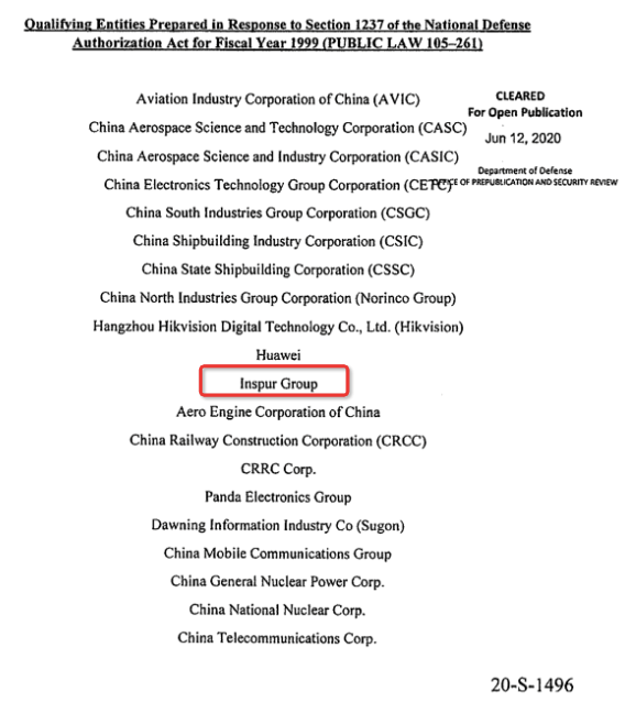 而浪潮就在上述清單之中。美國五角大樓發(fā)言人喬納森·霍夫曼稱,“該清單包括由中國政府、軍方或國防工業(yè)擁有、控制或存在關(guān)聯(lián)的實體。”這份清單都有誰呢?這份清單的 20 家中國公司分別為: